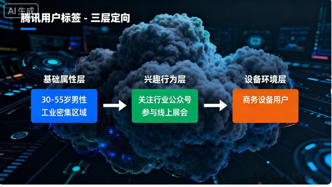 依托腾讯12亿+用户标签,可实现“三层定向”:基础属性锁定30-55岁男性、工业密集区域;兴趣行为定向触达关注行业公众号、参与线上展会的潜在客户;设备环境优先推送商务设备用户,确保专业场景曝光。