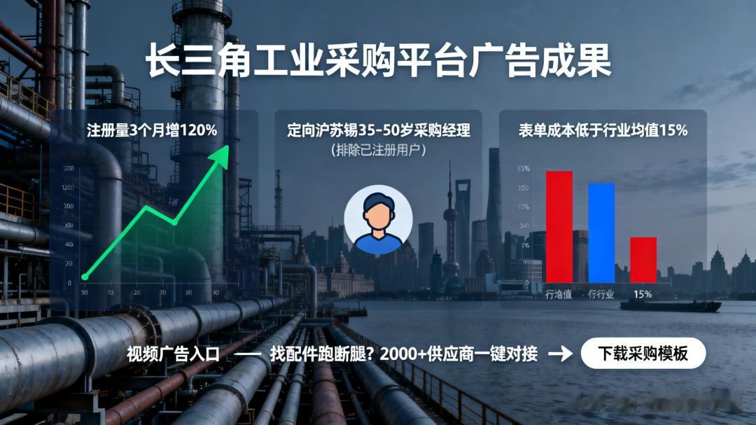 某长三角工业采购平台借朋友圈广告3个月注册量增120%:定向锁定沪苏锡35-50岁采购经理,排除已注册用户;视频广告以“找配件跑断腿?2000+供应商一键对接”切入,引导下载采购模板;落地页留资后弹出专属客服,最终CTR达2.8%,表单成本低于行业均值15%。