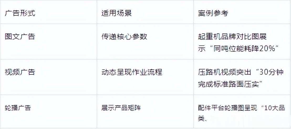 初创企业/新品推广以品牌曝光为主,用视频展示设备技术(如“液压系统节能30%”)、基建项目案例;成熟企业聚焦线索获取,设置“免费领解决方案”按钮,落地页搭配资质证书提升留资率。