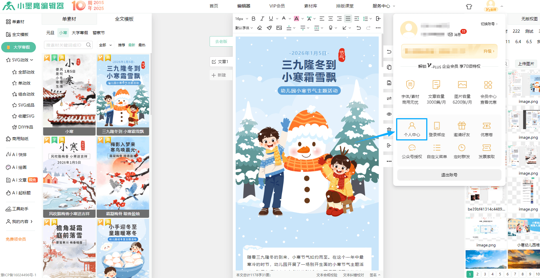 打开小墨鹰编辑器,右上角能找到自己的头像,点一下,进入个人中心。里面有个叫“系统设置”的地方,点进去。找到“传图水印”这个选项,这里默认可能是关闭的,你先把它打开。这是第一步,把总开关开启。