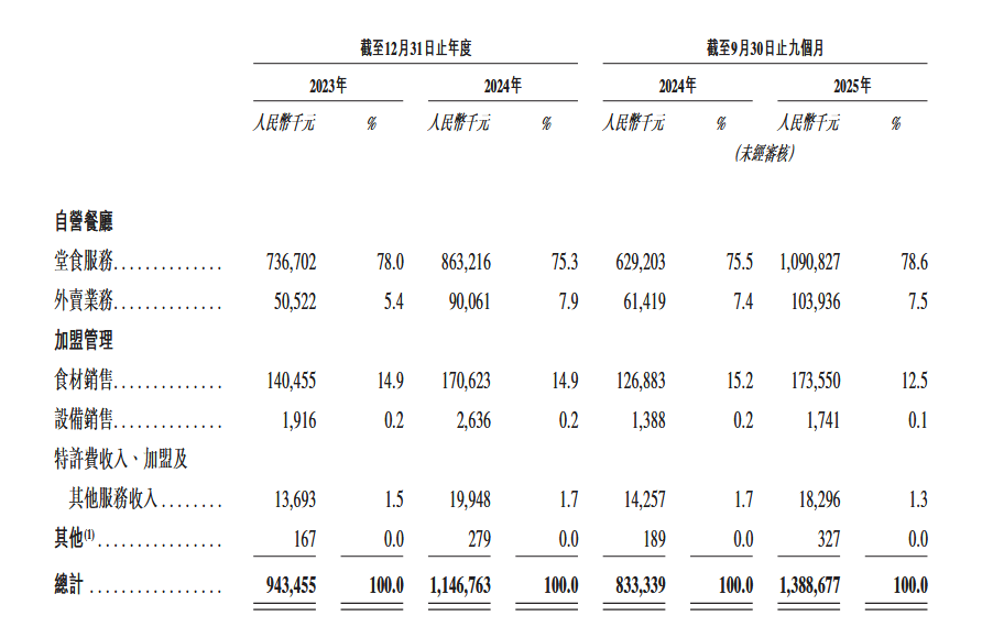 业绩方面,2023年、2024年及2025年前9个月,比格比萨分别实现营收9.44亿元、11.47亿元、13.89亿元,期内利润分别为4752万、4174万元、5165万元,净利润率分别为5.0%、3.6%及3.7%。