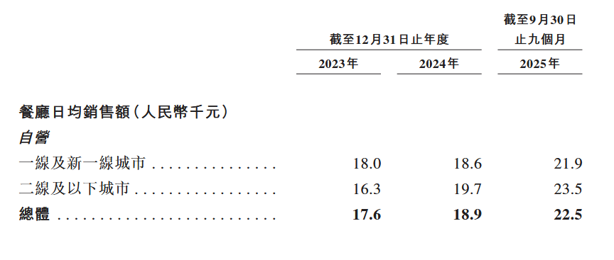 而比格比萨招股书显示,截至2025年9月30日,比格比萨在一线城市及新一线城市拥有135家自营餐厅、11家加盟餐厅,在二线及以下城市拥有130家自营餐厅、66家加盟餐厅。得益于下沉市场的强劲需求,2025年前9个月,其二线及以下城市门店的日均销售额已达到2.35万元,反超了一线及新一线城市的2.19万元。