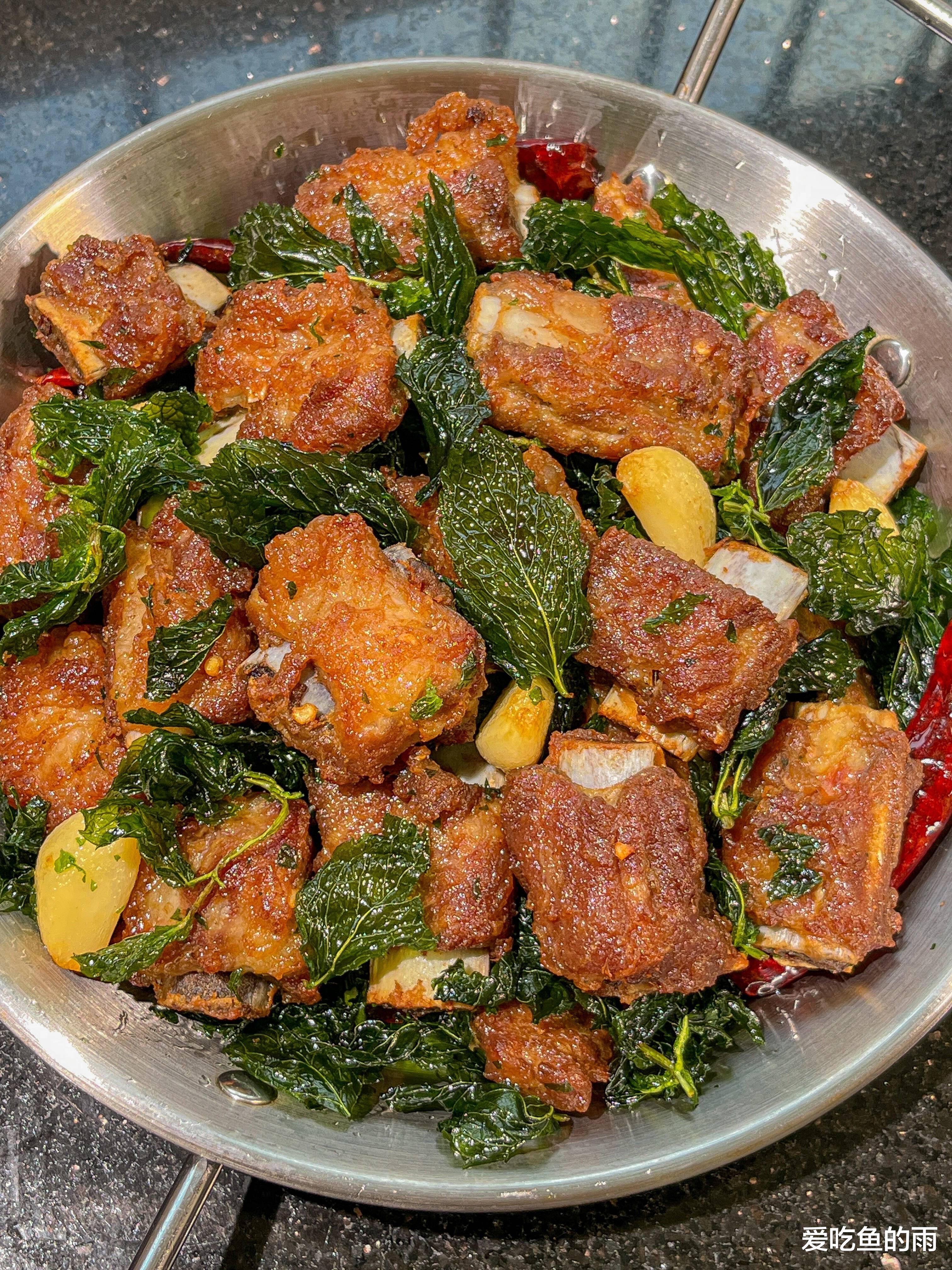最关键的时刻来临:当排骨炸至金黄熟透,捞出沥油,油温再次升高,将拍了淀粉的薄荷叶迅速投入油中。只需两三秒,薄荷叶在热油中舒展,由翠绿转为鲜亮的碧绿,香气瞬间爆发,带着清冽的凉意与油香融合。迅速捞出,与炸好的排骨轻轻翻拌,让每一片薄荷叶都依偎在排骨旁。我曾在一个冬日的傍晚,在温州老城区的一家小馆子里第一次尝到这道菜。老板端上桌时,热气裹着薄荷的清香扑面而来,排骨金黄,薄荷碧绿,色彩对比鲜明得让人眼前一亮。夹起一块排骨,咬下去,外皮酥脆,肉质鲜嫩多汁,紧接着,薄荷叶的清冽香气在口中绽放,既解了炸物的油腻,又带来一种冬日里难得的清爽,仿佛在寒冷中点燃了一簇温暖的绿焰。