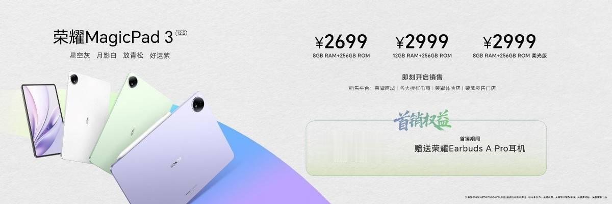 荣耀还推出了兼具轻薄高颜值的全新荣耀MagicPad3 12.5,并新增“放青松”、“好运紫”两款潮流配色,以及类纸柔光屏版本。荣耀MagicPad3 12.5搭载荣耀MagicPad3 Pro同款的165Hz高刷屏、PC级WPS Office以及Pro级AI体验。好轻、好看、好AI的荣耀MagicPad3 12.5,现已正式开售,消费者可于线上线下渠道选购。