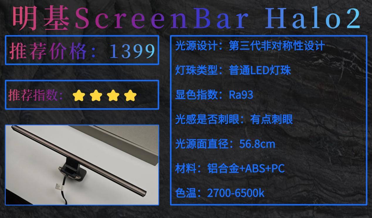 配置及体验:明基ScreenBar Halo2支持2700K–6500K无极色温调节,光效覆盖暖黄到冷白全色域。搭载第三代ASYM-Light非对称光型与U型背光模组,实现屏幕零反光,并营造柔和均匀的环境光,中心照度轻松超过国AA级标准。智能交互方面,配备无线控制器与环境光感+人体检测传感器,支持入席自动开灯、离席定时关灯,操作便捷自动光感在黑色桌面下灵敏度偏低,且需使用原装5V3A适配器才能保持最佳亮度,整体表现仍属行业天花板级别,但价格较高。