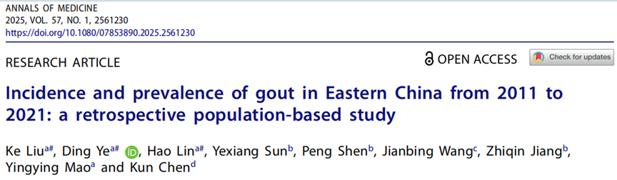 [2]LIU K, YE D, LIN H, et al. Incidence and prevalence of gout in Eastern China from 2011 to 2021: a retrospective population-based study[J]. Ann Med, 2025;57(1):2561230. DOI: 10.1080/07853890.2025.2561230.