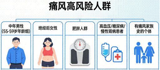 从高风险人群来看,中年男性(55-59岁年龄组)、绝经后女性、肥胖人群、高血压/糖尿病/慢性肾病患者,以及有痛风家族史的个体,仍是痛风防控的重点对象。尤其需要关注的是,中国痛风负担的峰值年龄(55-59岁)较全球(60-64岁)提前,提示中年群体需要更早启动预防措施,避免疾病提前发作并进展为慢性状态。