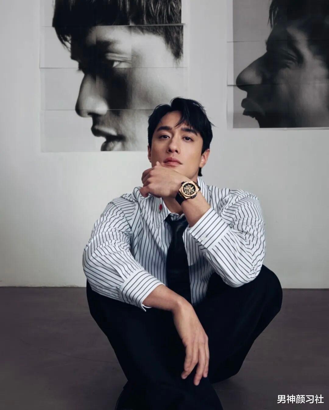 深色条纹衬衫配西装裤,系上深色领带,手戴质感腕表。这是极简主义下的权力穿搭。