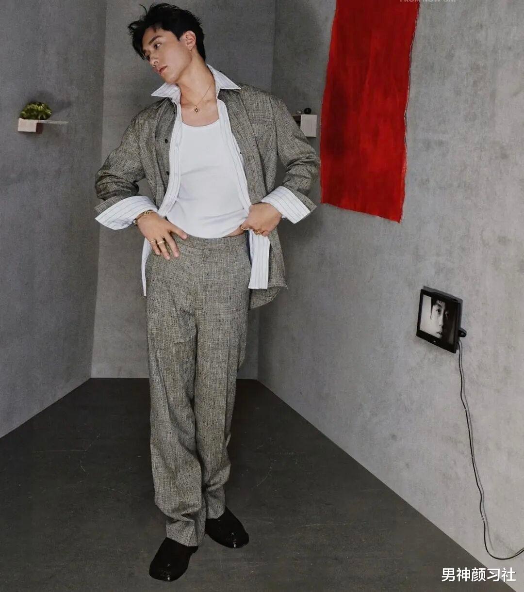 很多人怕穿整套粗花呢担心显老。刘俊谦的逻辑是去正式感。他用一整套粗花呢西装内搭白背心,脚踩黑色皮鞋,这种粗粝材质与细腻皮肤的碰撞,反而穿出了一种鲜活的现代感。