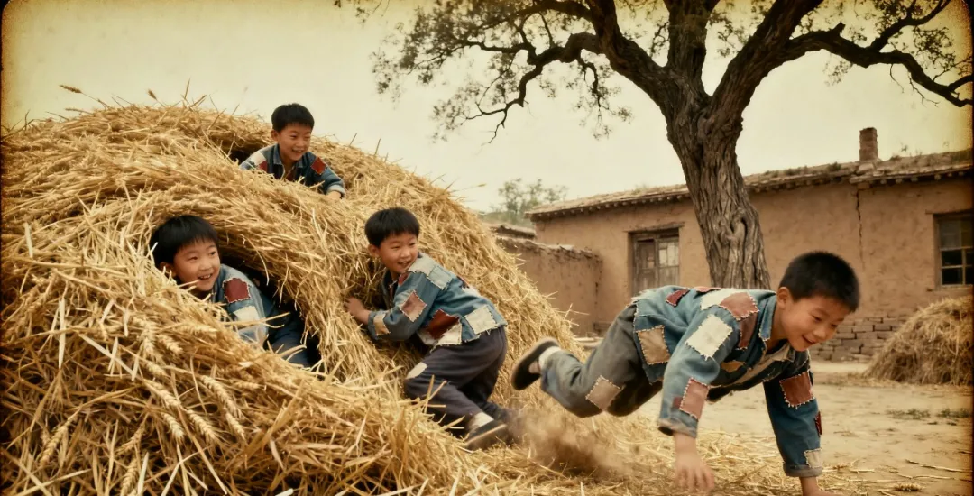 我们光着膀子在道场上滚爬,把晒干的麦秸垛挖出个大洞,在里面挖出长长的通道,钻进去玩耍,你推我搡的,麦秸粘得满身都是。