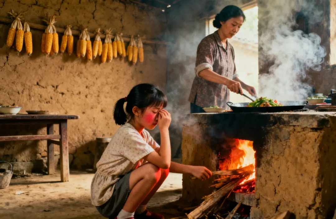放完牛,就蹲在灶台边帮母亲烧火,柴火塞多了冒黑烟,呛得直咳嗽。