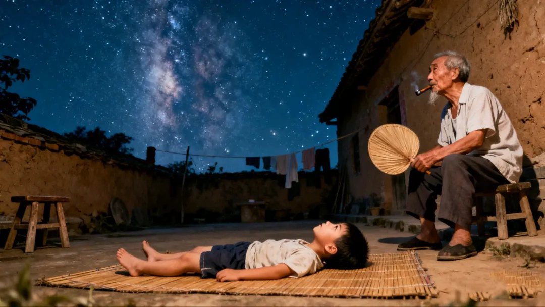 到了傍晚,把竹床搬到道场里,躺在上面凉丝丝的,听爷爷讲以前种地的事儿,看着天上的星星,不知不觉就睡着了。