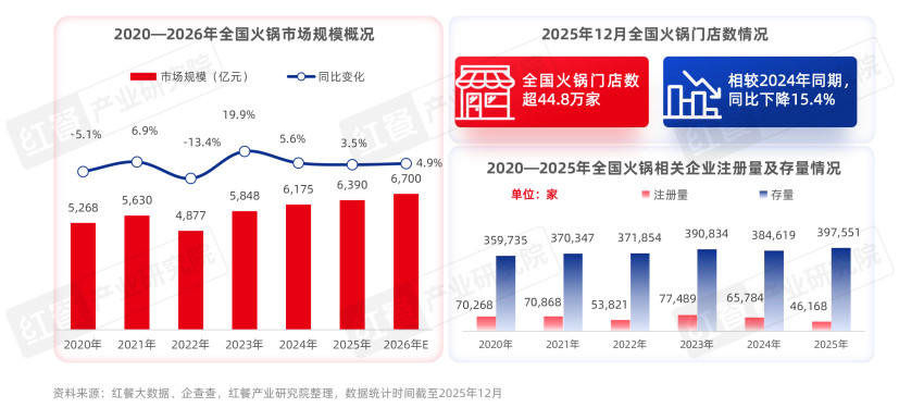 随着越来越多的区域火锅开启全国化扩张,近年来全国火锅市场规模持续增长。据红餐大数据,2025年全国火锅市场规模达到6390亿元,同比增长3.5%。据红餐产业研究院测算,2026年市场规模有望达到6700亿元。