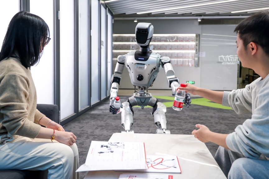搭载COSA的全尺寸人形机器人Oli完成移动操作,把两瓶水递给客人