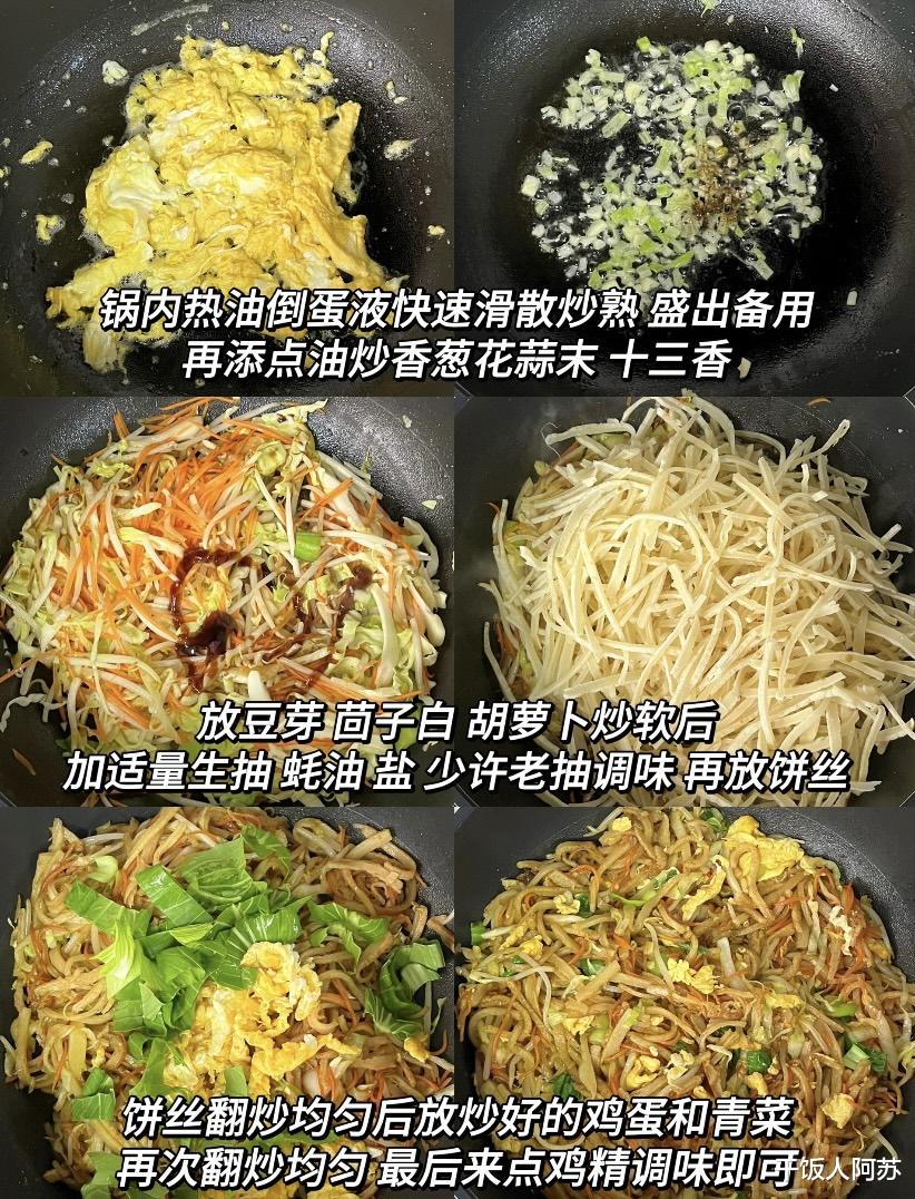 这道菜不仅快手,还能根据喜好调整配菜,比如加火腿丝、肉丝,或者换成土豆丝、洋葱丝,怎么搭配都好吃。下次不知道吃什么的时候,试试这盘炒饼丝吧,简单又满足,保证让你连盘子都想舔干净!