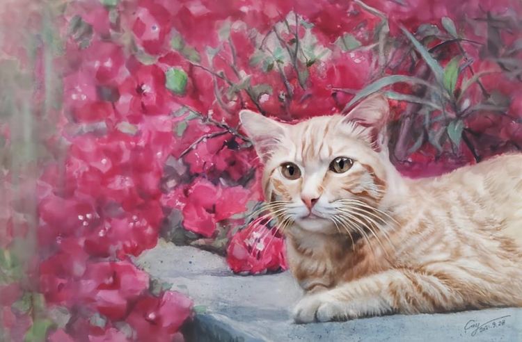 《叔婆》 油画 50Ⅹ60cm 2019年《猫与花》 水彩画 36Ⅹ53cm 2021年《绽放》 水彩画 36Ⅹ26cm