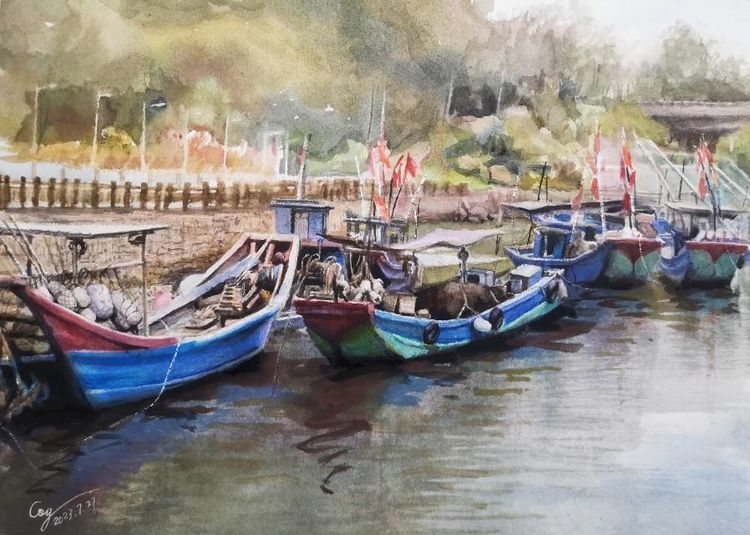 《避风港》 水彩画 38X53cm 2022年