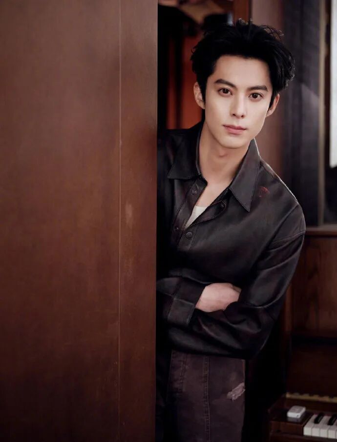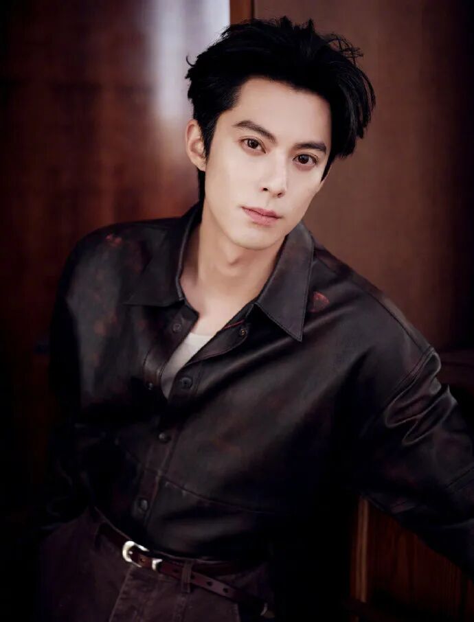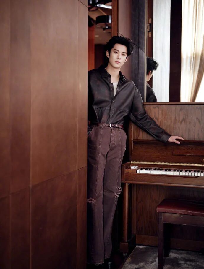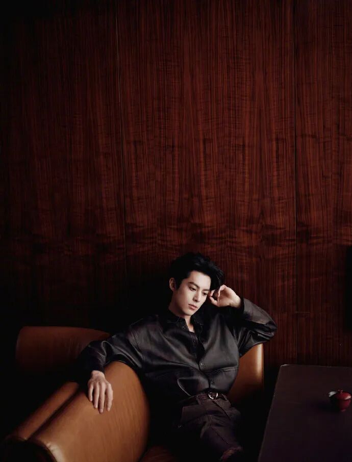哑光皮质衬衫选得太绝了 —— 不是亮面那种油腻感,而是带着细腻肌理的低调质感,微阔肩的剪裁刚好撑起他的肩线,不会垮塌也不会紧绷,抬手整理领口时,袖口微微挽起露出小臂线条,硬朗里透着点随性;搭配的水洗直筒牛仔裤更显心机,裤腰微微上提拉长比例,裤脚的自然磨白和皮衬衫的哑光质感形成呼应,不会显得头重脚轻。