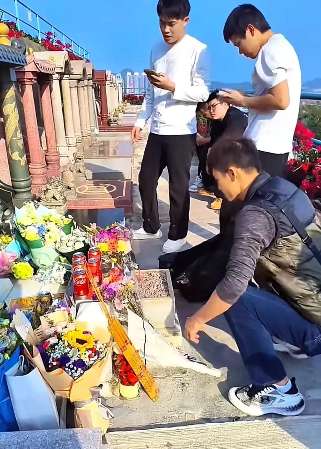 从照片看,7号那天是大晴天。墓地周围都是干干净净的,唯独是黄家驹的墓地有水淹。歌迷们打扫完后就开始祭拜,带了很多鲜花和贡品,十分有心。