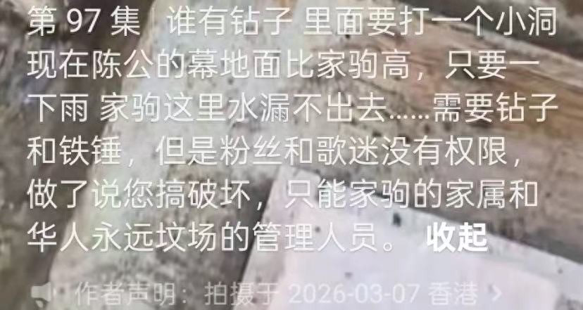 歌迷把这些发到了网上,引起很多歌迷热议。黄家驹的弟弟黄家强也被粉丝们问责,难道这些年家属都不管的吗?每年去祭拜的话,肯定会发现墓地被水淹的,除非一年都去不到一次。