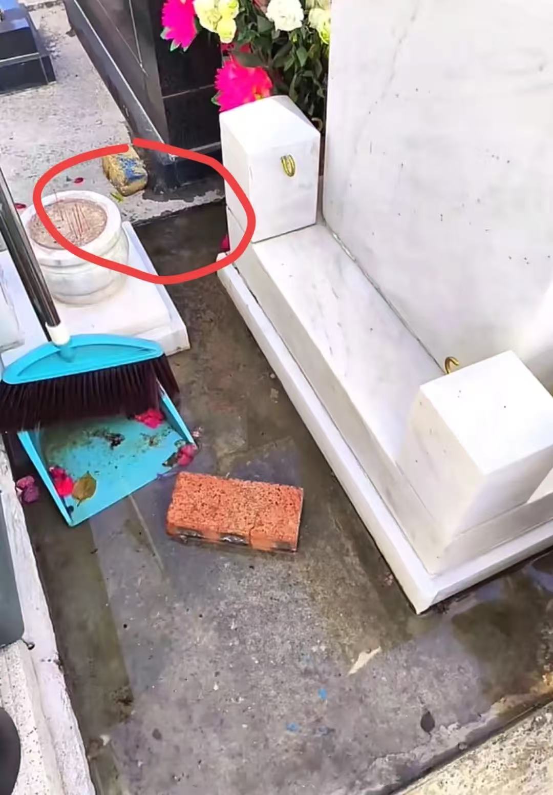 看到黄家驹墓地全是水,歌迷们只好去借来扫把扫水,如果没人管理,在清明前后,估计黄家驹的墓地就会一直被水淹。