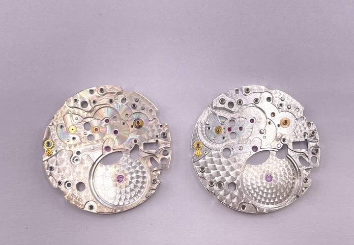 下方图片左边为正品4131机芯零件,右边为上海4131机芯零件。
