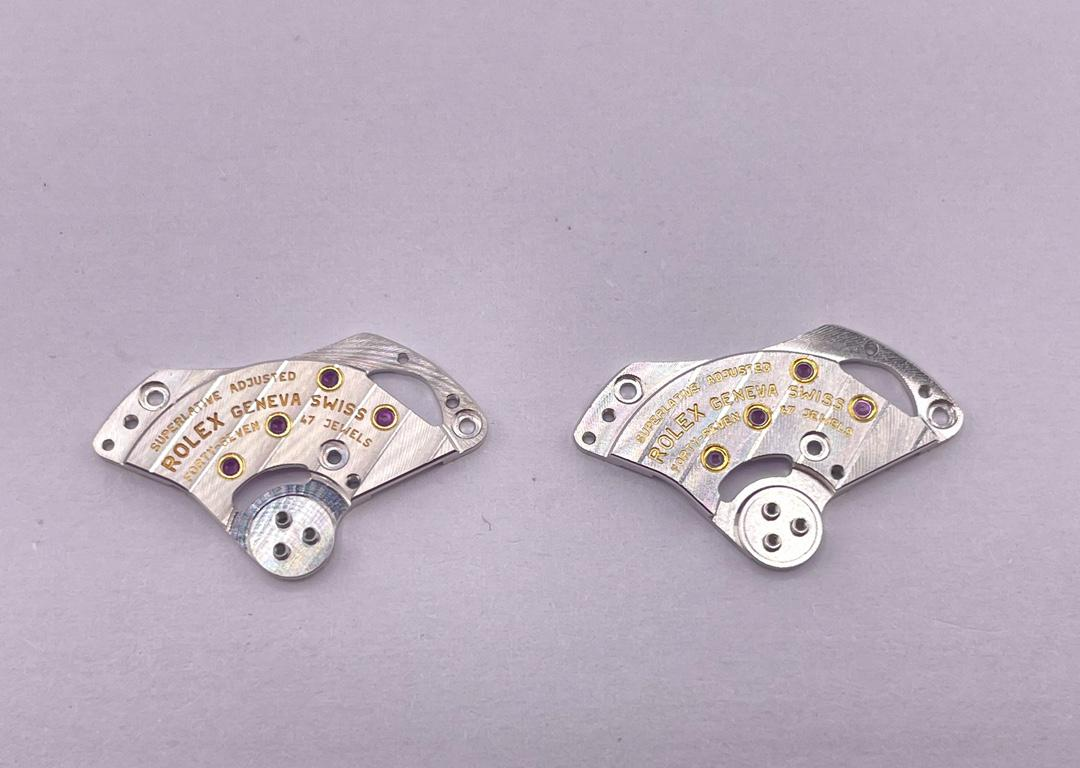 首先,我们通过机芯底座的整体对比,看出C厂4131机芯和正品几乎没有差别,同样采用鱼鳞纹打磨工艺,每个轴承孔位也逆向抄数复刻。机芯的尺寸和厚度完全同正品一致,这款机芯动能75小时左右,机芯打磨,电镀,刻字,组装均由c厂独立完成。