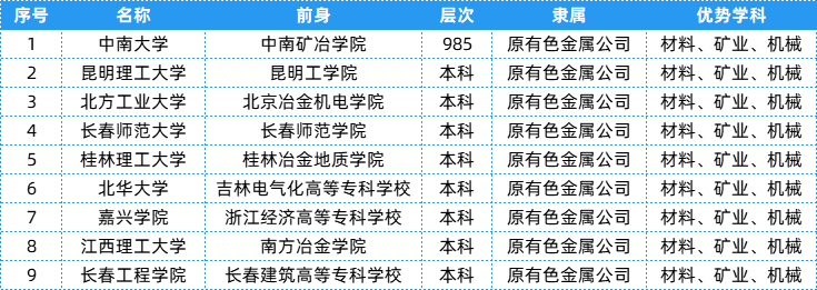12.有色金属公司相关院校共有9所,层次、隶属及优势学科等具体信息可以参考下表~