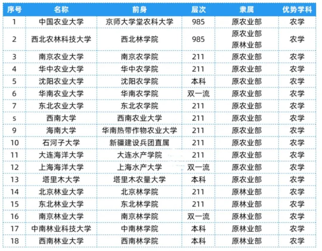 14.农业部/林业部相关院校共有18所,层次、隶属及优势学科等具体信息可以参考下表~