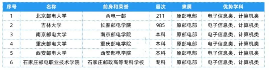 10.邮电部相关院校共有6所,层次、隶属及优势学科等具体信息可以参考下表~