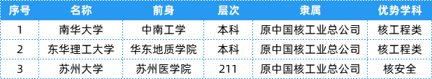 13.核工业相关院校共有3所,层次、隶属及优势学科等具体信息可以参考下表~