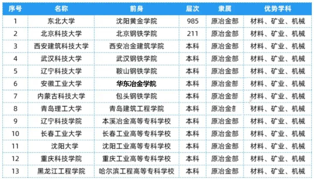 15.冶金部相关院校共有13所,层次、隶属及优势学科等具体信息可以参考下表~
