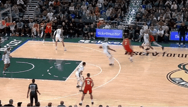 NBA常规赛,火箭客场对阵雄鹿的比赛正在进行中。