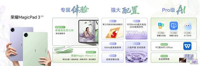 荣耀还推出了兼具轻薄高颜值的全新荣耀MagicPad3 12.5,并新增“放青松”、“好运紫”两款潮流配色,以及类纸柔光屏版本。荣耀MagicPad3 12.5搭载荣耀MagicPad3 Pro同款的165Hz高刷屏、PC级WPS Office以及Pro级AI体验。好轻、好看、好AI的荣耀MagicPad3 12.5,现已正式开售,消费者可于线上线下渠道选购。