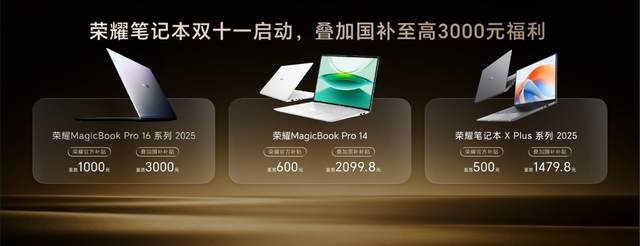 荣耀还公布了一系列持续回馈老用户的福利:购买荣耀MagicPad3 Pro最高配置可享300元升杯券;即刻起,将在多款平板机型中陆续升级MagicOS 10与PC级WPS功能。另外,2021年4月后发布的荣耀PC全系也将获得YOYO助理升级推送,双11期间购买荣耀笔记本,更有叠加国补最高省3000元的优惠福利。