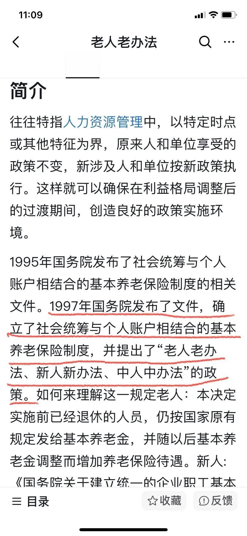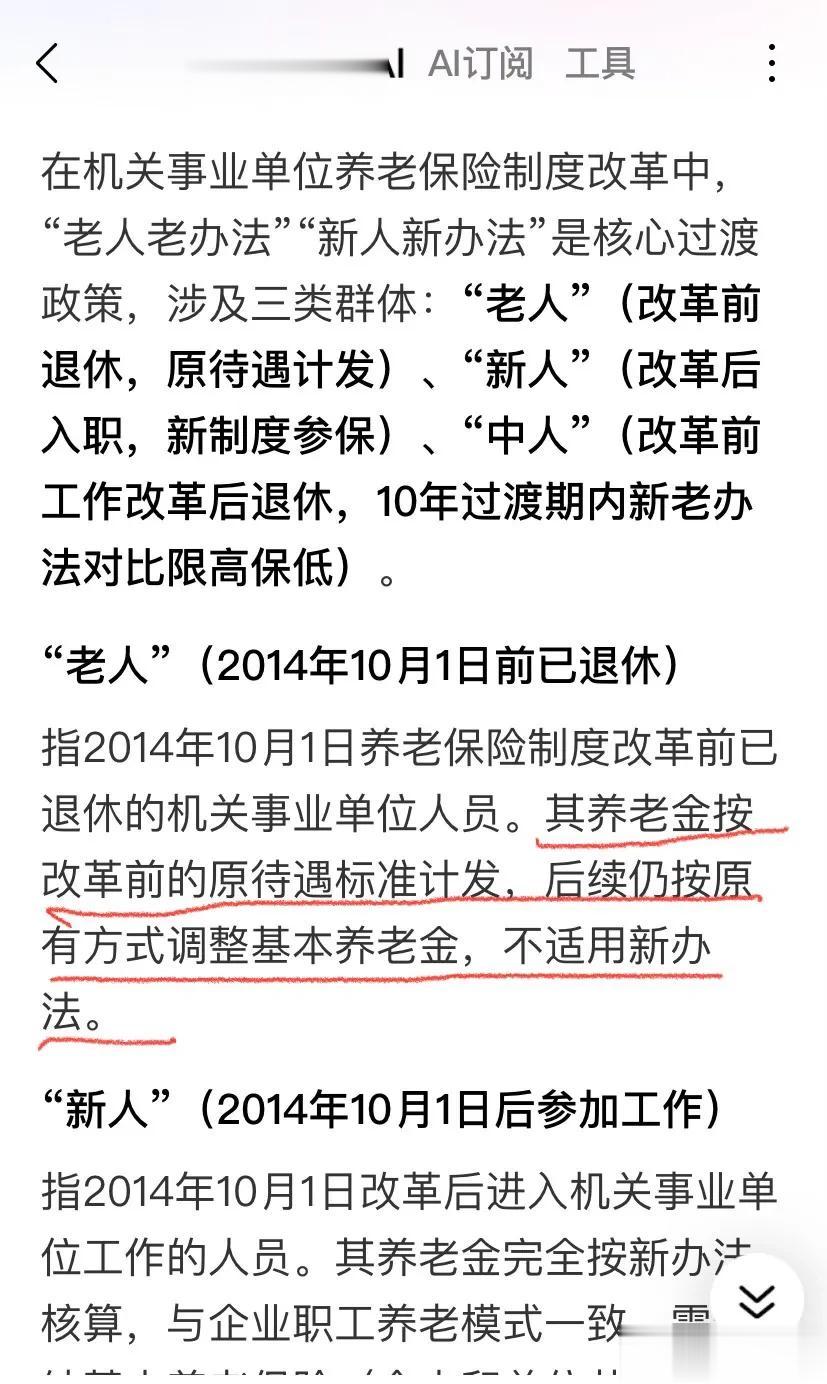 我们先看看AI解释的“老人老办法”,这个解释是非常清楚的,它首先指出在机关事业单位养老保险制度改革中,“老人老办法”、“新人新办法”是核心过渡政策。它所涉及的人群是三类人群,即:“老人”(改革前退休,原待遇计发)、“新人”(改革后入职,新制度参保)、“中人”(改革前参加工作改革后退休,10年过渡期内新老办法对比限高保低)。