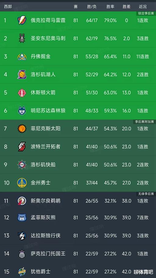北京时间4月11日,NBA常规赛第81轮所有比赛结束,我们看看西部的最新排名!前六名的球队分别是:雷霆、马刺、掘金、湖人、火箭和森林狼,这以上6队只有掘金和湖人的名次还没有确定。附加赛区7-10名的球队分别是:太阳、开拓者、快船和勇士,开拓者和快船的名次还没有百分百确定!最后5名11-15的球队分别是:鹈鹕、灰熊、独行侠、国王和爵士!