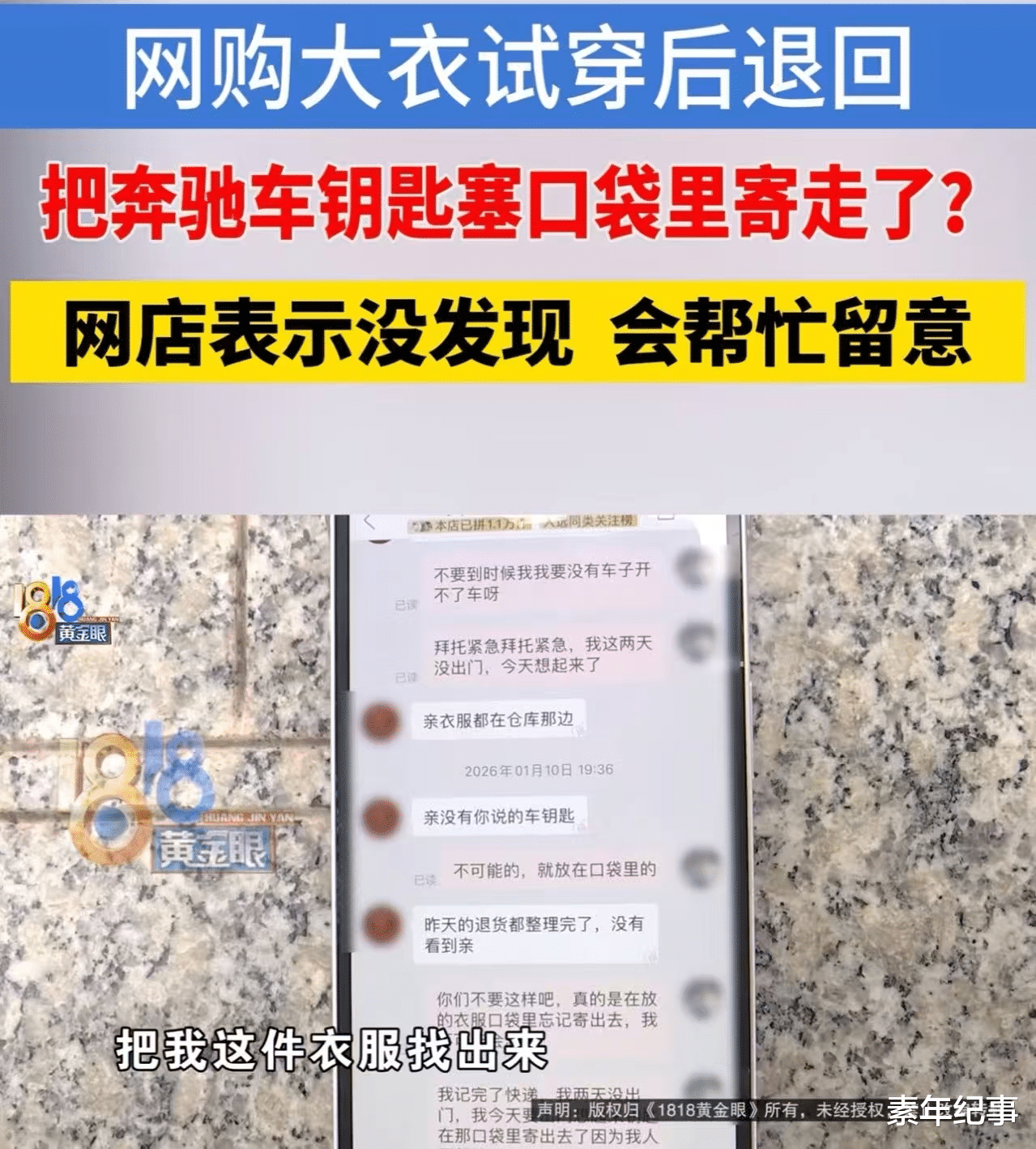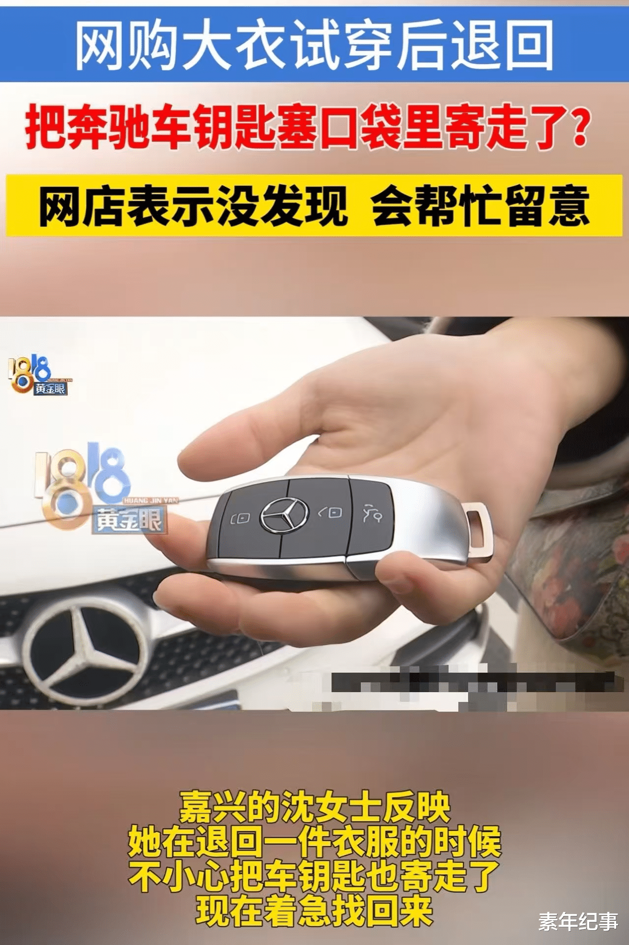 嘉兴沈女士 2026 年 1 月寄退 150 元网购大衣时,误将奔驰车钥匙放入口袋寄出,商家称未发现且衣服已二次售出,截至 2026 年 1 月 31 日钥匙仍未找回,她需花 6000 元重配。