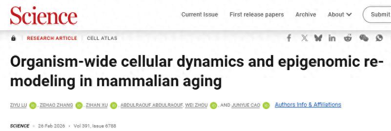 Lu Z, Zhang Z, Xu Z, Abdulraouf A, Zhou W, Cao J. Organism-wide cellular dynamics and epigenomic remodeling in mammalian aging. Science. 2026 Feb 26;391(6788):eadw6273. doi: 10.1126/science.adw6273. Epub 2026 Feb 26. PMID: 41747035.