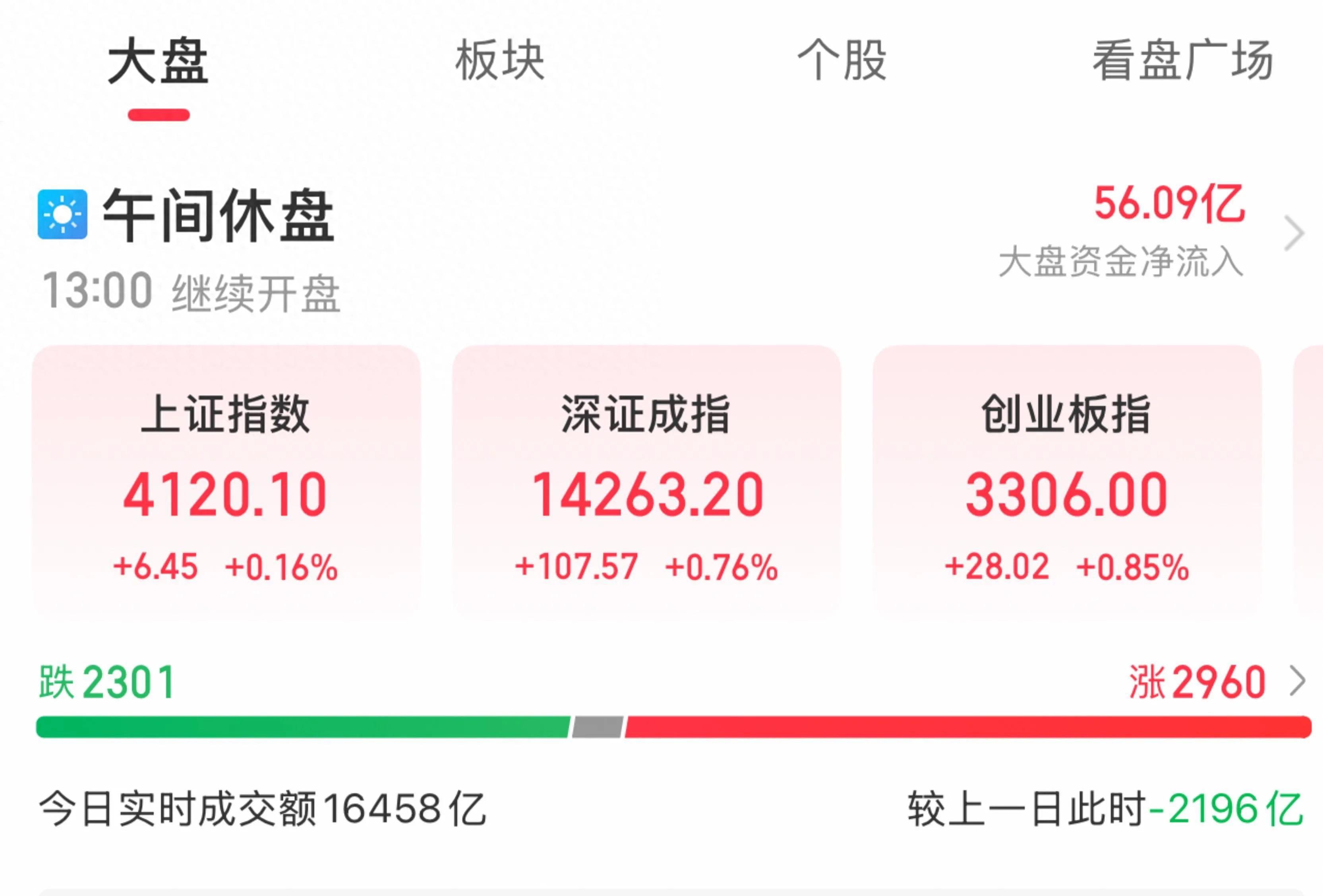 三大指数集体低开后快速回暖,上演“V型”反弹,截至午间收盘,上证指数微涨0.16%报4120.1点,深证成指上涨0.76%,创业板指涨幅达0.85%,科创50指数更是强势拉升近3%,成为盘面亮点。
