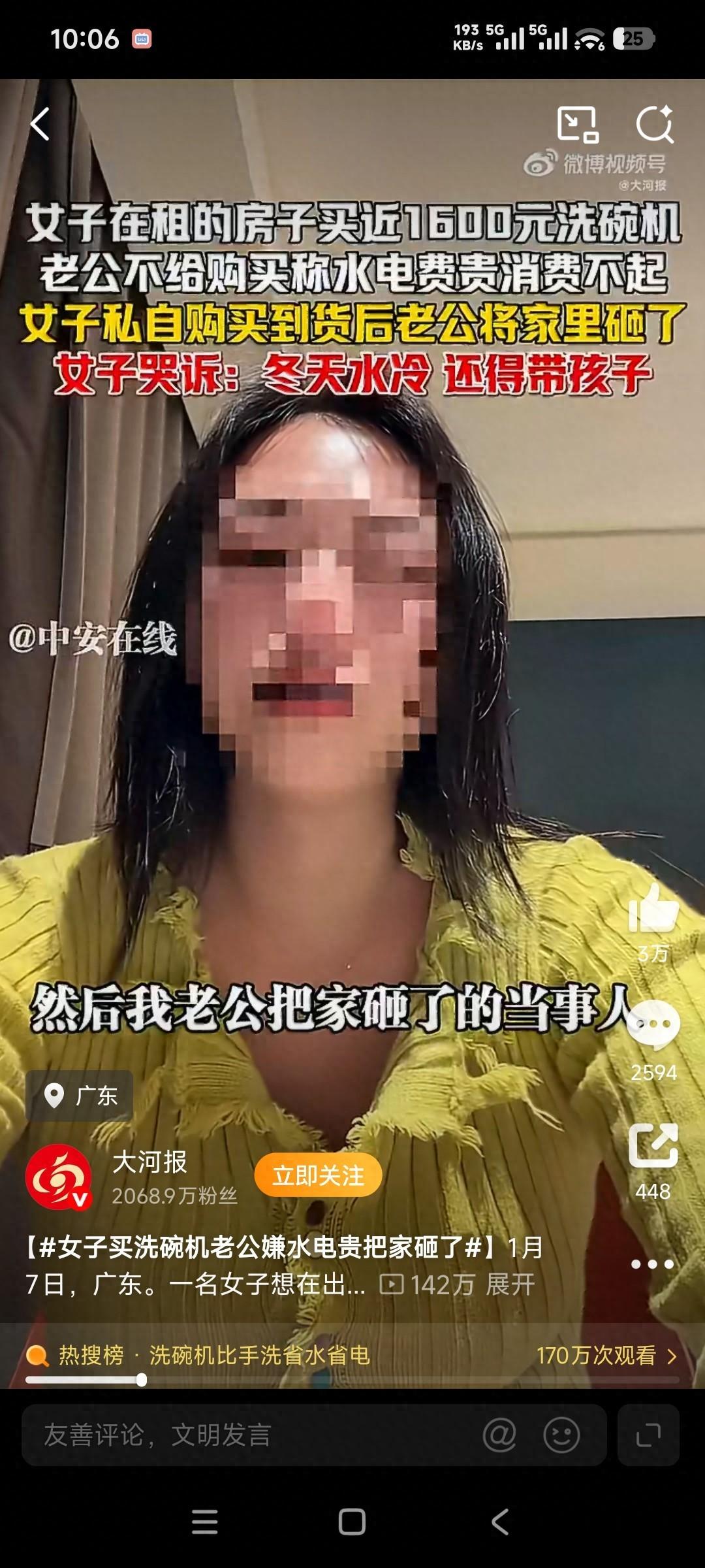 女子在后来的发声中说:“冬天水冷自己并不想洗碗,老公也不洗,自己还得带两个孩子。” 而丈夫的反对理由是:“水电费贵消费不起”。
