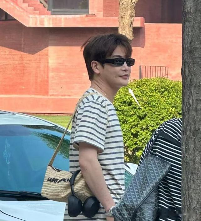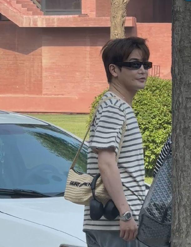 照片中,孙坚戴着墨镜,穿着条纹短袖搭配宽松牛仔裤,背着小挎包,包上还挂了一副耳机,打扮得十分休闲。期间,孙坚与一位助理往前走,他脸上面带笑容,心情看上去不错。