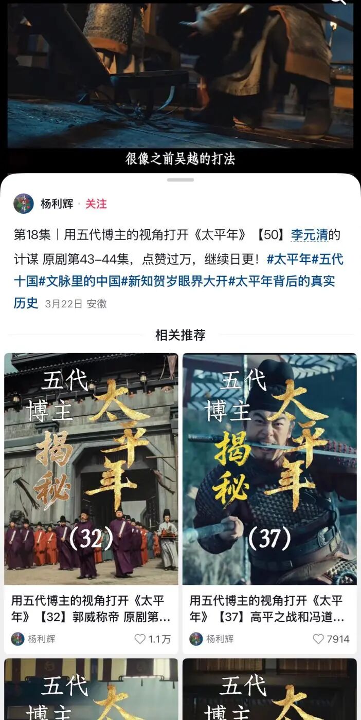 这位白天是软件公司程序员、夜里化身历史科普博主的“码农”,从2020年就开始“死磕”五代十国,曾做过一条长达26小时的五代史科普视频,却长期不温不火。《太平年》开播后,他的解说视频意外走红,成了无数观众追剧的“历史外挂”。