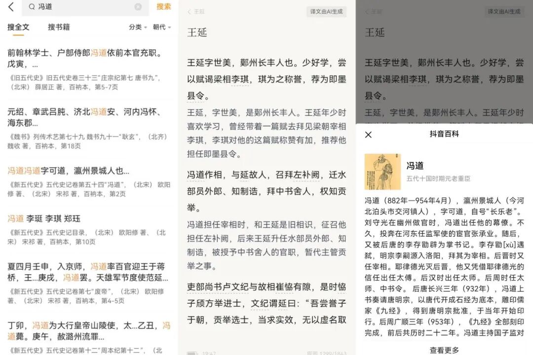 这位“四朝十代元老”在《太平年》里是个重要配角,弹幕里天天有人问“这人到底是好是坏”。在搜索框敲下名字,几秒钟后,《旧五代史》《新五代史》《资治通鉴考异》等文献中所有关于他的记载全列了出来。点开一篇,原文、译文、注释整整齐齐。原文里“道”“冯道”“可道”这些不同称呼,AI全给划了线,不仅告诉你是同一个人,点开后,关于“冯道”的百科便跃然纸上。