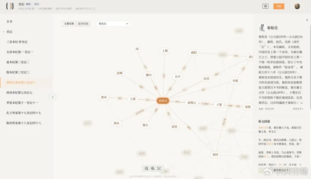 最新上线的实体关系图更是把“读史”这件事玩出了新花样。它可以通过一张图,直观了解整篇古文中关键的人物、地点、时间等信息和他们之间的关系。有网友说:“要是当年学历史的时候有这个功能,我也不至于把赵高和蒙恬的关系记反。”