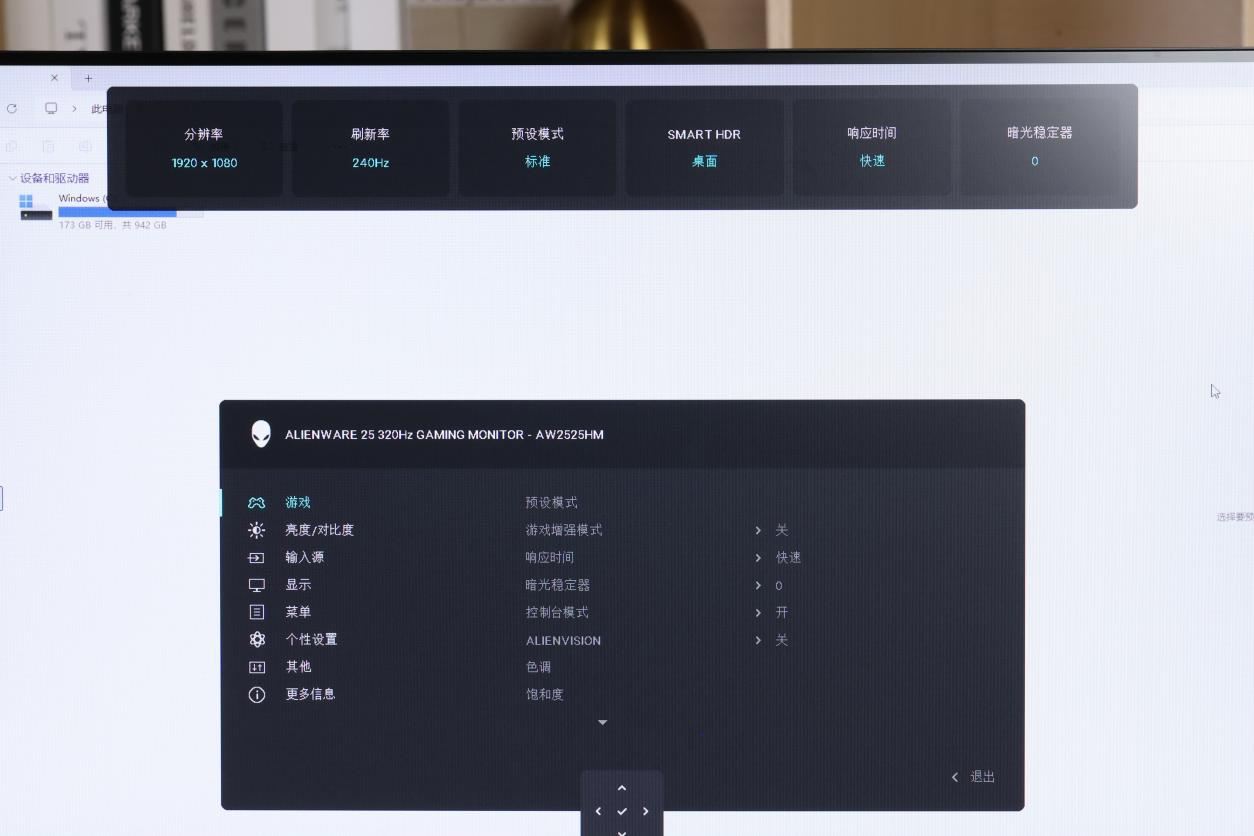 按下OSD导航键之后,OSD菜单界面的上方会实时显示当前显示器的状态,包括分辨率、刷新率、预设模式以及响应时间等参数。同时,OSD菜单界面提供游戏、亮度、对比度、输入源、显示、菜单、个性设置以及其他等丰富选项。当然,除了亮度、对比度之外,比较核心的功能包括预设模式、响应时间、暗光稳定器以及ALIENVISION。