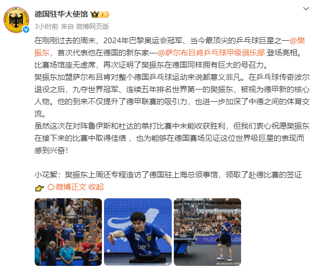 北京时间9月2日消息,德国驻华大使馆在社媒发文回顾中国乒乓球奥运冠军樊振东在德甲的首秀,大赞樊振东在德国同样拥有巨大的号召力,其加盟萨尔布吕肯对整个德国乒乓球运动来说都意义非凡。