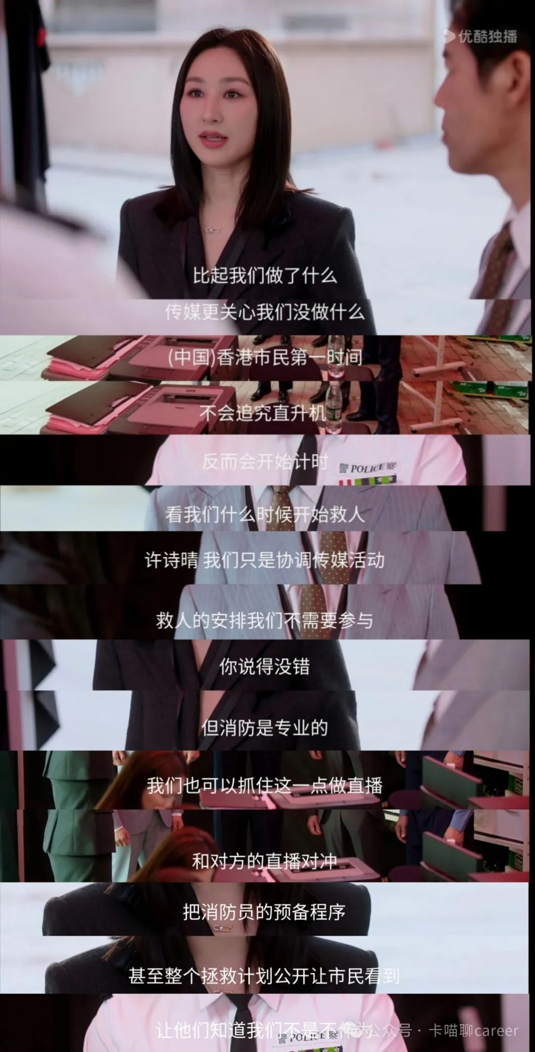 唐楼坍塌已成事实,作为当下最紧急的事情是什么?一味地强调直升机直播的不合法或者跟随记者步调局限在坍塌的原因,她选择将角度切转到消防援救的角度,和对方的事故角度做对冲,公开救援过程让民众不只陷在灾难的视角不安和不满,又很好地展示了消防的应急措施,可谓一举两得。