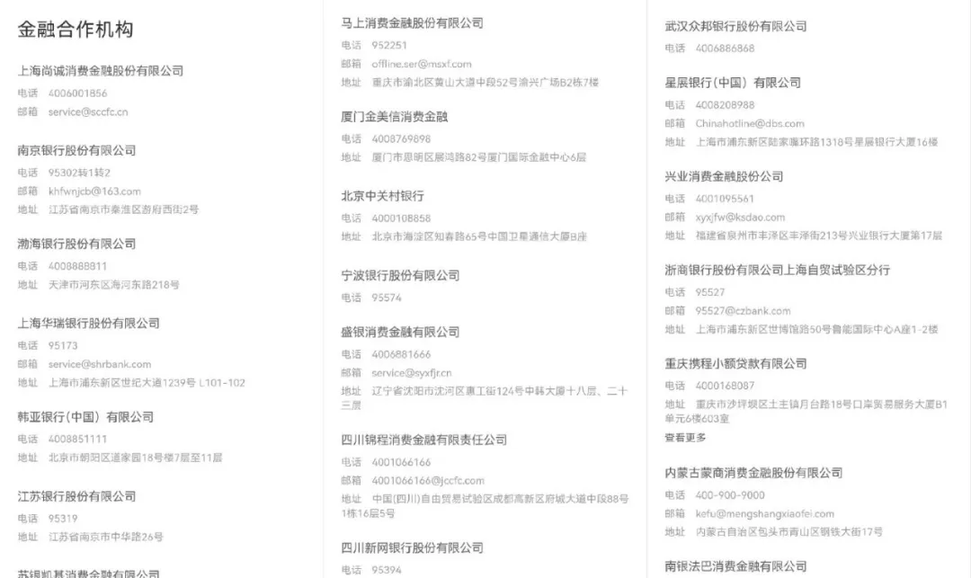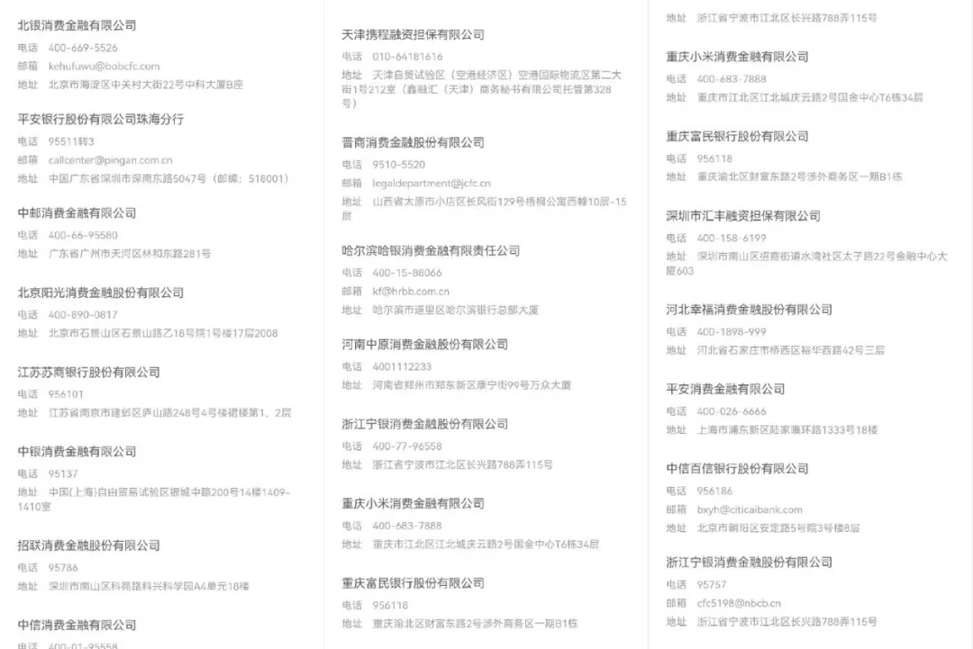 包括北银消金、中邮消金、招联消金等持牌消金;以及富民银行、中关村银行、华瑞银行等民营银行;还有浙商银行上海自贸试验区分行、平安银行珠海分行等股份行分行。