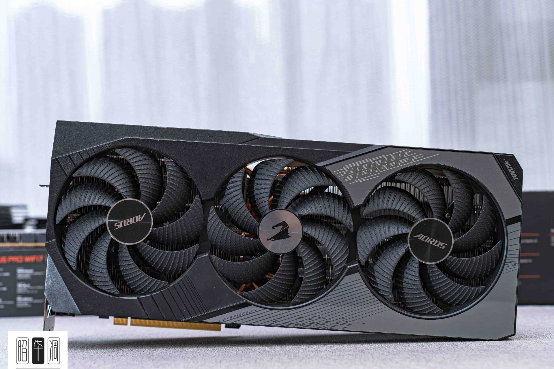 ▼ 显卡顶部的 AORUS LOGO 同样具备 RGB 灯效,支持神光同步,并可以通过技嘉的 GCC 控制中心软件自定义灯光模式和颜色。正面的风扇在旋转时,扇叶上的 RGB 灯珠会亮起,形成漂亮的环形灯效。更有趣的是,灯光效果还会随着风扇转速的变化而同步改变,非常炫酷。